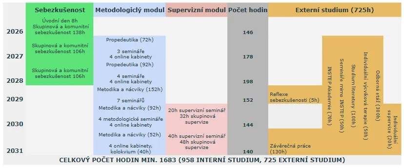 INSTEP XII má celkem čtyři části. Tři z nich - sebezkušenost, metodologie a supervize tvoří interní studium. Paralelně s ním probíhá externí studium. Interní studium hradí studenti/ky INSTEPU, externí si zajišťují/platí sami. (Náklady detailně popisujeme a vyčíslujeme - viz Finanční podmínky níže - abychom předešli nepříjemnému překvapení z neočekávaných výdajů.) Celkem výcvik obsahuje minimálně 1683 výukových hodin (45 min, dále jen hodin) z toho 958 interního a 725 externího studia.